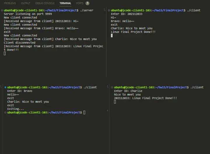 - Client Processing Thread: Creates one thread per connecting client. Each thread independently waits for messages from its assigned client. Upon receiving a message, it calls the message function to relay it to all other clients